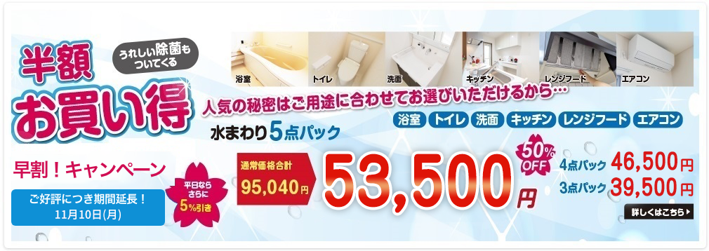 大人気の水まわりのクリーニングを3箇所からお選びいただけるお得なパックとなります。お忙しい時、後まわしにしまった時などプロがしっかりお手伝いします。